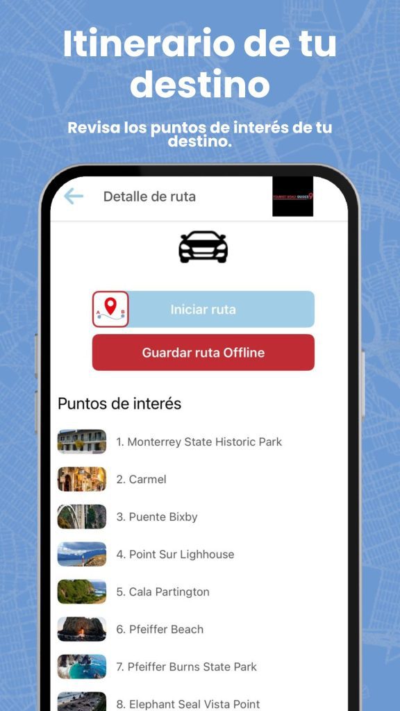 En Tourist Road Guides hemos desarrollado nuestra app de road trip pensando en la seguridad y la tranquilidad del viajero. Sabemos que en muchos viajes por carretera la conexión a internet no siempre está garantizada, por eso nuestra app de rutas en coche incluye mapas offline, para que nunca pierdas el rumbo. Con los mapas descargados en el móvil, puedes seguir tu ruta, localizar paradas y explorar nuevos lugares incluso en zonas sin cobertura. Esto permite disfrutar del road trip con mayor confianza, evitando desvíos innecesarios y reduciendo el estrés durante el viaje. Nuestra app de road trip con mapas offline combina navegación GPS, rutas escénicas y audioguías, asegurando que cada trayecto sea más seguro, fluido y organizado. Así, puedes concentrarte en lo importante: disfrutar de la carretera y del destino.