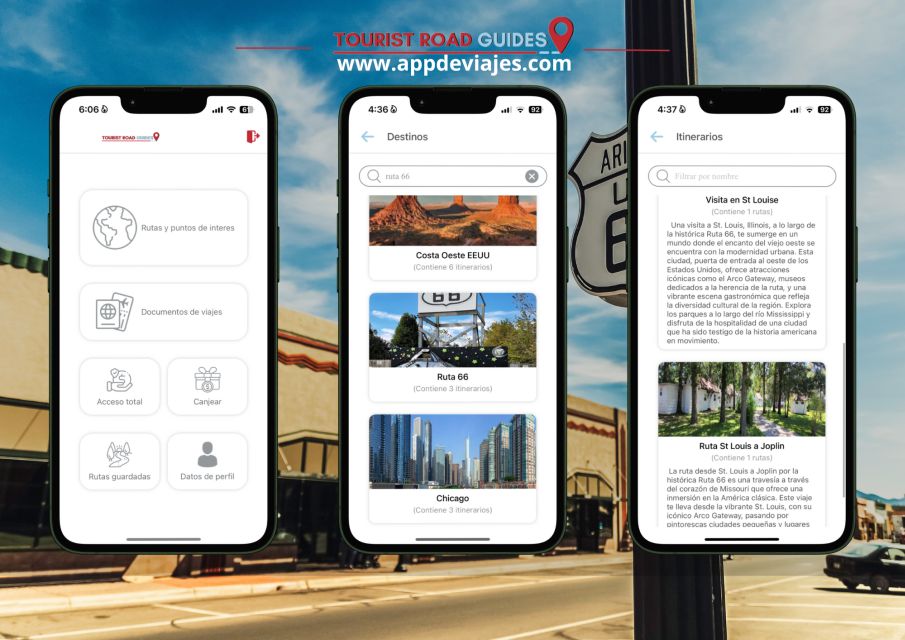 Una vez efectuada la reserva, recibirás un e-mail con un enlace a la aplicación de Tourist Road Guides y un código de acceso, que podrás canjear una vez te hayas registrado. El código te dará acceso a todos los itinerarios, rutas y puntos de interés con App Audioguia Ruta 66 St Louis a Joplín en Estados Unidos.