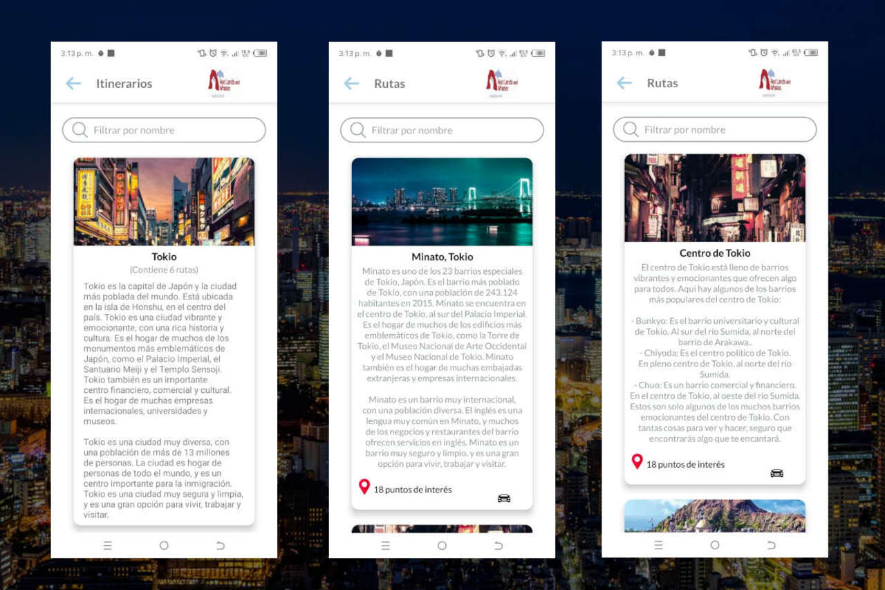 – Minato: Esta ruta cuenta con 18 puntos de interés disponibles con información textual y audio guiada de cada uno. También contiene rutas a pie y en coche para visitar el barrio en su totalidad. Entre los puntos de interés se encuentran: la Torre de Tokio, la sede de Fuji TV, Odaiba, el Parque Daiba, el Puente Rojo del Arco Iris, la Estatua de la Libertad, Gundam, Divercity, Miraikan, Aqua City, Roppongi Hills, Decks, el Templo Sengakuji, el Museo Nezu, el Museo de Arte Mori, Shibakoen, el Museo Ako Gishi y el Crucero Sumida.