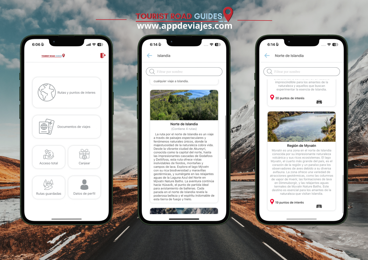Una vez efectuada la reserva, recibirás un e-mail con un enlace a la aplicación de Tourist Road Guides y un código de acceso, que podrás canjear una vez te hayas registrado. El código te dará acceso a todos los itinerarios, rutas y puntos de interés con audioguía del Norte de Islandia.